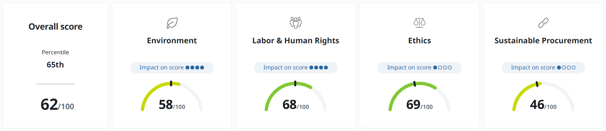 EcoVadis is one of the world’s most trusted providers of business sustainability ratings, assessing over 125,000 companies globally. Its methodology evaluates four core areas; Environment, Labour & Human Rights, Ethics, and Sustainable Procurement; to measure how well a business integrates CSR principles into its operations.
